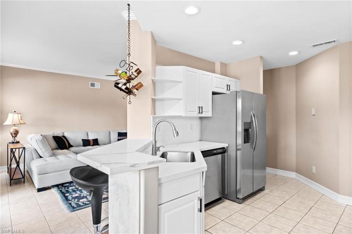 1st Floor Coach home with magnificent panoramic views of the 3rd fairway from tees to green and large lake separating this home from the golf course, so NO golfers in your backyard. Upgrades galore from the screened in front entrance, crown molding, updated light fixtures, accordino hurricane shutters on windows and electric hurricane shutter on lanai area. Kitchen has been renovated with refaced cabinets with pull out shelving, subway backsplash, Brand New Stainless Frigidaire appliances, Quartz counter tops and farmer sink. The 3rd bedroom is set up as an office with Bamboo flooring, pocket door, and the closet has a built-in desk. The primary bath & guest bath were tastefully updated with new faucets, Quartz counter tops and the guest has a seamless glass enclosure.