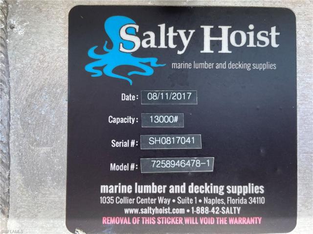 Hickory Bay Boat House 35' long wet slip with 13k boat lift with new motors, GEM control box and power pedestal. Ample and convenient to parking plus a short walk to restaurants. Docking is simple with minimal maneuvering, straight in and out. Minutes to the Gulf of Mexico via Wiggins Pass or New Pass. On site fuel, pump out station, fish cleaning station, ice, refreshments and 24 hour restrooms with showers.