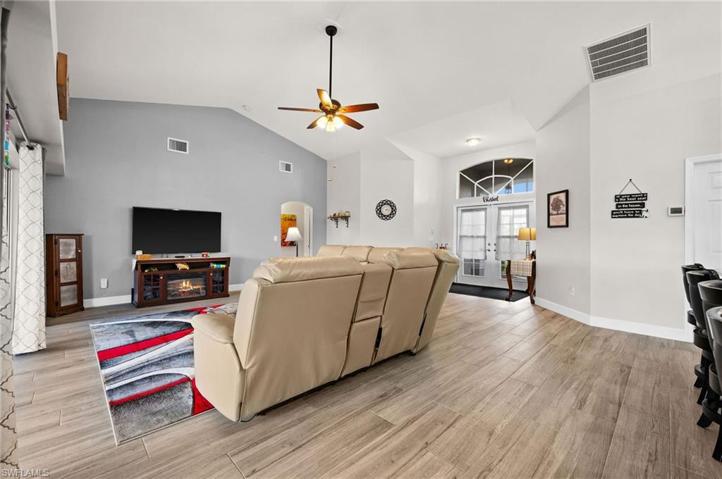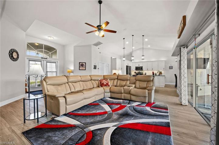 Welcome to your dream home! This 3 Bedroom, 2 Bathroom, 2 Car Garage Pool home in Cape Coral, features a bright and open floor plan, tile flooring in main living areas, vaulted ceilings, recessed lighting, and SO MUCH MORE! 2022 ROOF, NO HOA FEES & NO FLOOD REQUIRED!! CLICK ON THE VIRTUAL TOUR LINK 1 FOR THE VIDEO AND VIRTUAL LINK 2 FOR THE 3D TOUR. You'll be the life of the party with an open floor plan, ideal for entertaining. The kitchen was updated in 2022 with ALL stainless steel appliances, Quartz countertops, plenty of cabinets for storage, tiled back splash, breakfast bar and off kitchen dinette. The large master bedroom has a glass slider for lanai access, HIS & HERS walk-in closets and private bathroom with a dual sink vanity, linen cabinet, ALL tile walk-in shower and a soaking tub. The guest bedrooms are a fantastic size with a shared near by bathroom with a walk-in shower and access to the lanai. Step out to your private oasis where you can take a dip in crystal clear water of the solar heated pool or soak up the sun on the pool deck. Conveniently closet to shopping, dining, live entertainment, and a short drive to award-winning beaches. Schedule your showing today!