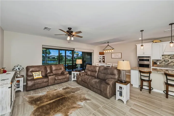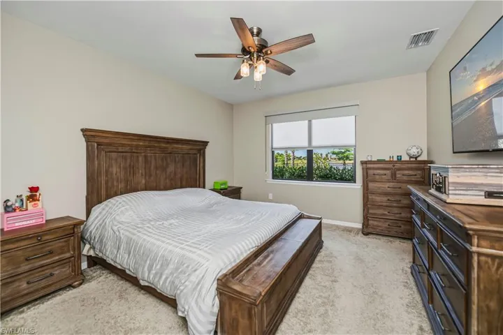 This impressive 5 bedroom/4 bath home was built on an oversized lot within the extraordinary River Hall community and absolutely checks all the boxes. The two-story home boasts an open concept floor plan downstairs where the kitchen, which has a stainless-steel appliance package, beautiful granite counter tops and a full-length island, adjoins a spacious dining room/living area which features a wall of sliding glass doors accessing the lanai. The paver-laid screened lanai, which overlooks the fully-fenced (with 3 gates) backyard and a lovely water view, also has an outdoor kitchen and a wall mounted TV as well as lanai screens which roll down providing ultraviolet light and hurricane protection. Also located on the ground floor is the luxurious master bedroom, which boasts a large closet and a well-appointed ensuite with a shower as well as an additional guest bedroom and bath. Tile floors are found throughout the downstairs while the upstairs is carpeted, except for the bathrooms. A large, comfortable common area can be found on the second floor – perfect for use as a home office or as a family media room. Three additional bedrooms can be found upstairs including a second master and ensuite (which has both a shower and a tub) and two additional guest bedrooms as well as a guest bath with a shower and tub combo. All bathrooms feature tiled showers as well as granite and quartz vanities. This beautiful home has a 2-car garage with sturdy storage shelves as well as a separate laundry room with a washer and dryer (both convey with the sale). Not only does this home have so many designer-inspired features such as the entryway foyer, recessed and contemporary lighting fixtures, and the wide paver-laid driveway, but it also boasts high-tech features associated with a Smart Home which controls door locks, the home’s A/C and the garage door. The ring doorbell camera conveys as does the 3 wall mounted televisions. River Hall is an extremely well-maintained community brimming with amenities which include an active country club and championship golf course as well as multiple swimming pools and recreational facilities. This is the quintessential Florida lifestyle at its very best. Call to schedule your private showing today.