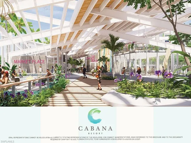 C.17399 - The end unit Sandy Cabana is the largest 3-Bedroom plan in Cabana. It has a gracious Foyer, open floorplan, island Kitchen and spacious Dining area. The wraparound Balcony can be accessed from the main living areas through three sets of slider doors for indoor/outdoor style. The Den is set off by a glass barn door and the Master Suite has a huge walk-in closet The Guest Suite has its own Balcony. All Cabana units have half baths. Cabana is bringing vacation destination amenities and day-through-night family focused attractions to Bonita Springs. Its 7 acres of Resort Pools feature a winding Lazy River, ‘surfable’ triple Flow Rider water feature, a pool with multiple water slides, all within 3 pool areas. 7 stories of energized contemporary architecture introduce a fresh face to Gulf view condo living with teak trimmed, unit-wide glass balconies and spacious floorplans, all bookended by massive ground to rooftop art installations. It’s Grand Food Hall is an airy and open expanse sheathed in glass for 360* views. It’s designed for boardwalk strolling, casual to fine dining, shopping, sampling and socializing in a year round setting.
