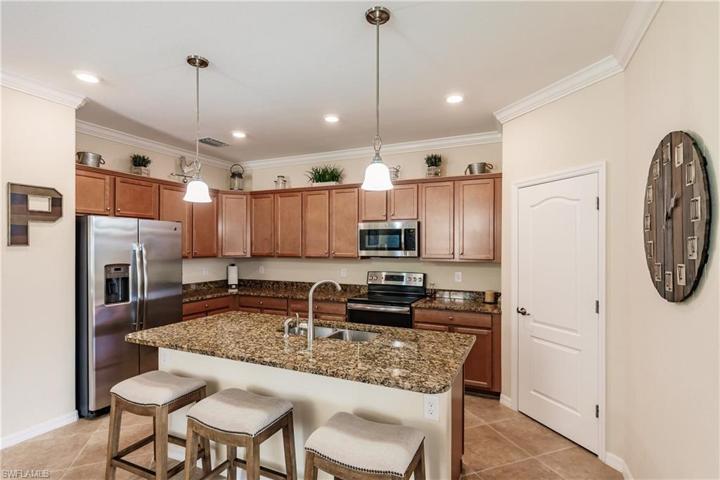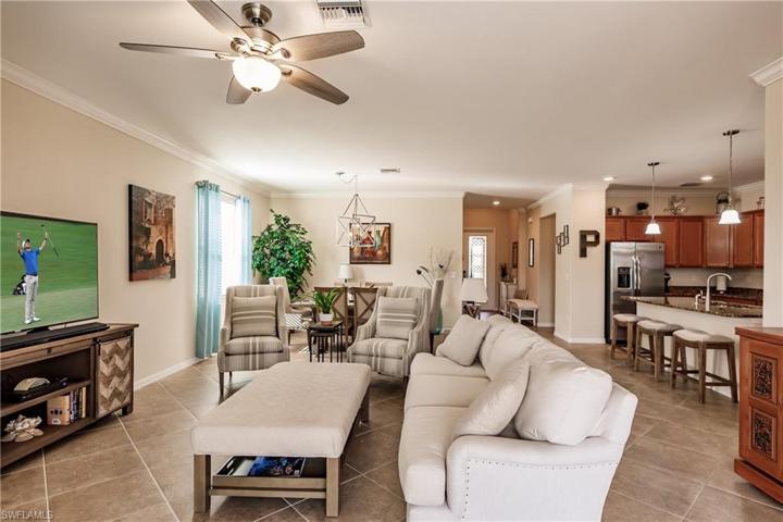 This METICULOUSLY maintained home in River Hall Country Club is now vacant and ready for you! The stone front porch is charming and inviting and you will feel warmth and comfort the minute you enter the home. The Venice floorplan is exceptional for entertaining with an open concept kitchen/great room/dining area. The entire home has crown molding, and each bedroom has gleaming hardwood floors. The 3 bedrooms and 3 full bathrooms have an abundance of closet space. Two additional hallway closets make storage a breeze. The master bedroom has his and hers closets, a walk-in shower and soaking tub. The saltwater pool/spa provide you with a serene view of #6 green and the pond. The lanai has two STORM SMART blinds. The amenities of River Hall Country Club don't just stop with a golf membership. You can enjoy the "members only" Bunker Bar/pool, the Town Hall Amenity Center that offers the state-of-the-art fitness center, bocce, pickleball, tennis, basketball, or just relax by the resort style pool. River Hall CC remains one of the best bundled golf values in SWFL and this home could be your piece of paradise. Memberships will be limited to Country Club residents in the near future.