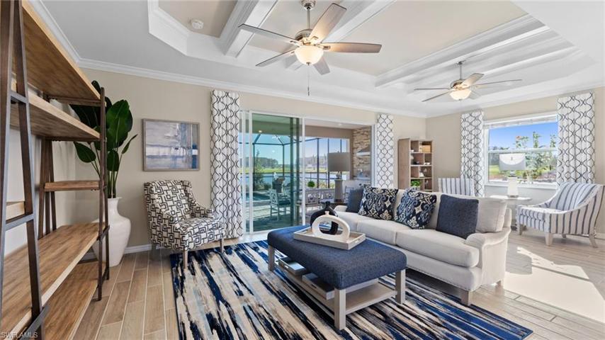 bedrooms + den offers 2.5 sumptuous bathrooms. The luxurious Owner's suite features a tray ceiling, private lanai access and elegant bath with dual vanities and ample storage. The den makes a perfect home office or hobby room. Side-load garage offers plenty of space for cars and storage. The National Golf & Country Club at Ave Maria will include signature residential home designs with Terraces, Verandas, Coach Homes, Executive Homes, and Estate Homes. Renderings, photos & virtual tour are of like model and are used for display purposes only. Estimated delivery September/October 2023.