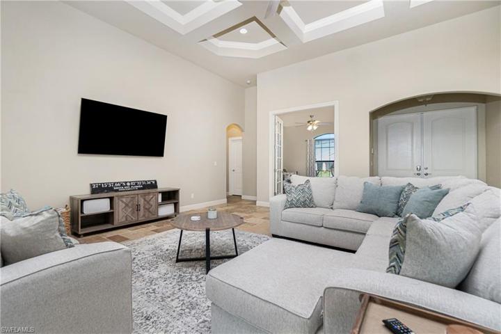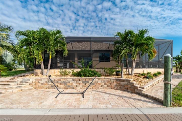 Hurricane tested!!! Stunning 4 Bed+ Den Pool Home with WATERFRONT DIRECT ACCESS! No bridges or locks to worry about! This beautiful home, with a Wind Mit & 4-point inspection completed in July 2024, boast Open Concept Layout: Split design with coffered ceilings, tray ceilings, and travertine floors throughout the main living area. Engineered hardwood in the bedrooms. Natural Light Galore: PGT Windows and 90-degree sliders flood the home with sunlight. Custom Outdoor Kitchen: Gorgeous granite countertops, stacked stone backsplash, Coyote Grill & Burner, fridge, and undermount sink. Perfect for entertaining! Stunning Indoor Kitchen: Soft-close cabinets, granite countertops, and stainless appliances.RO System: Enjoy fresh water throughout the home.