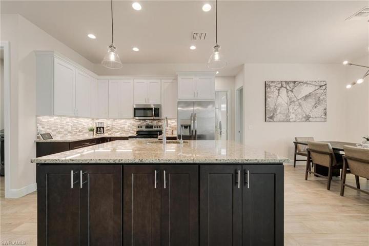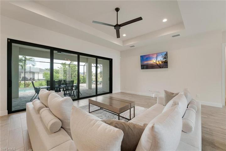 No need to wait to build your new pool home! This custom home builder Beattie Homes Samuel floorplan is situated in sought after SW Cape Coral south of Cape Coral Pkwy. Double glass door entry welcomes you to a spacious open concept floorplan with 9'4" ceilings. Your chefs kitchen offers an oversized island, tall cabinetry, extra storage, walk-in pantry, deep sink and upgraded pendant lighting. The spacious dining area is surrounded by windows out to the lanai. A wall of quad pocketing sliders invites you to the oversized southern exposure lanai offering a beautiful heated saltwater pool with plenty of entertaining areas. The master bedroom is spacious with walk-in closets, a spa-like bath with walk-in shower and a soaking tub. Bedroom #3 features an ensuite bath that doubles as a pool bath. Impact windows, doors and sliders, upgraded lighting and ceiling fans, whole house water softening system filtration system here! Quiet and peaceful neighborhood, yet a prime location - very walkable location. All conveniences you need just around the corner! Cape Harbour is only 1 mile away and Camelot Park nearby.